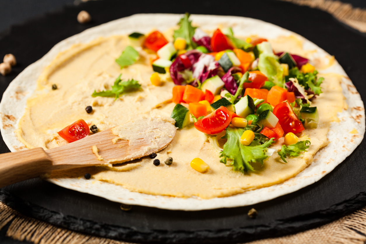A gluten‑free tortilla filled with fresh vegetables, creamy hummus, and crisp greens made simply, flavorful, fresh. (GF/VEG)